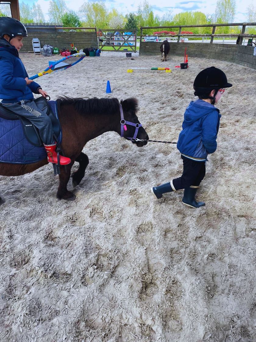 tandis qu’un second enfant, le cavalier, est sur le dos du poney.