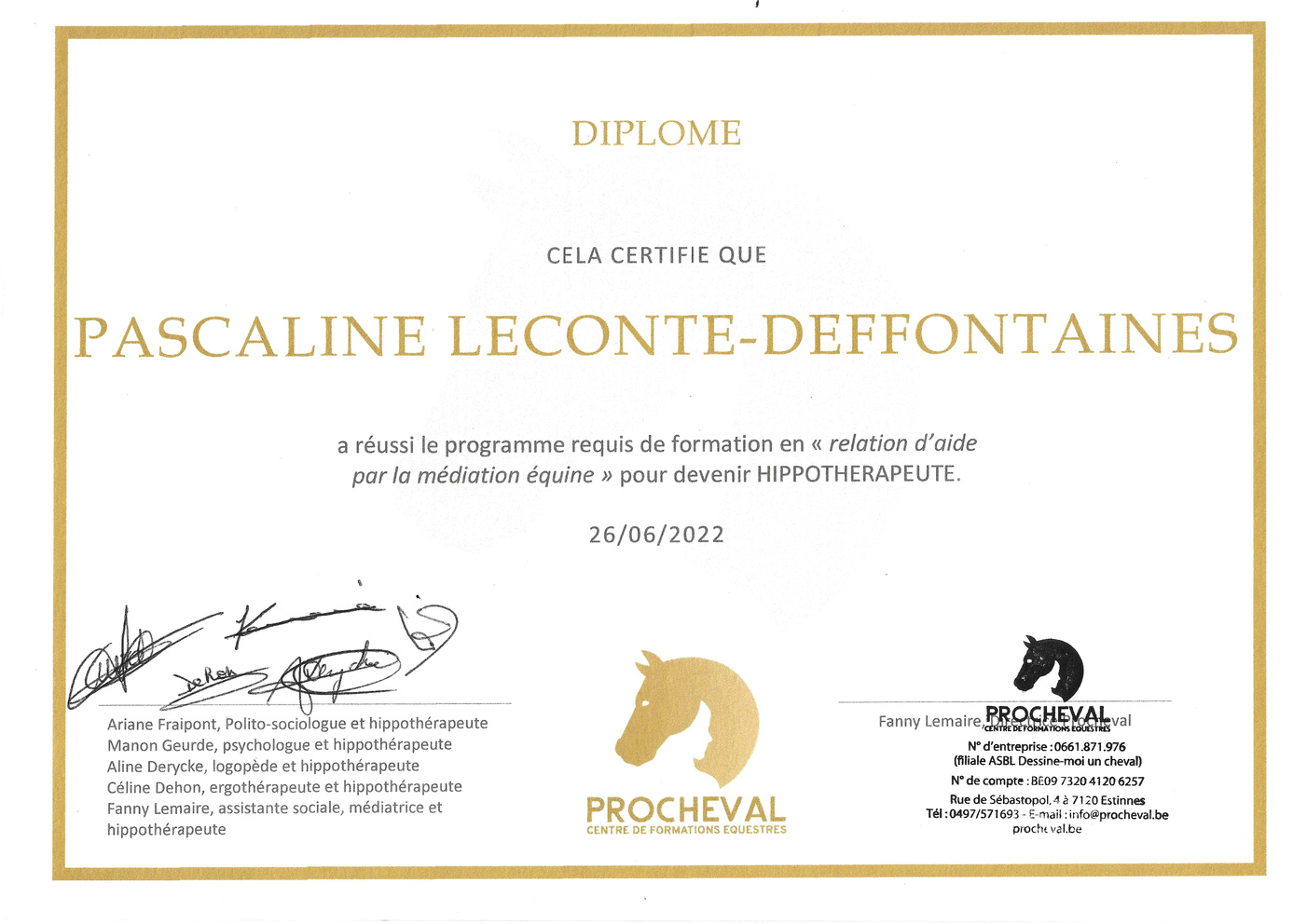 Après une formation de 2 ans de praticien en hippothérapie chez Procheval (Belgique), durant laquelle j’ai eu